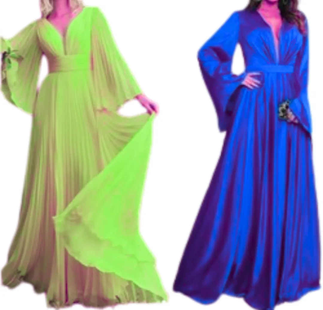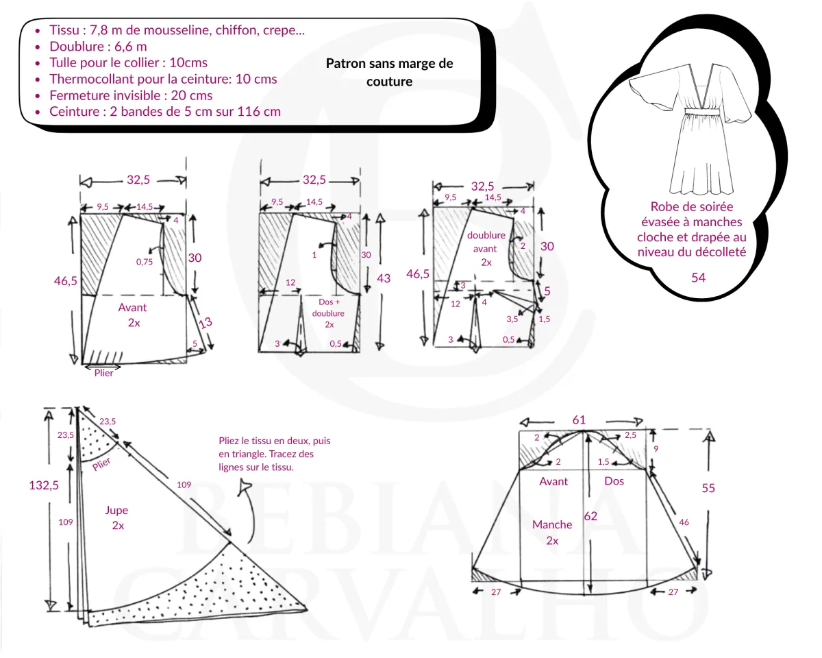 Schéma de patron de robe de soirée évasée à manches cloche et décolleté drapé en V, de la taille 34 à la taille 44 grande taille.