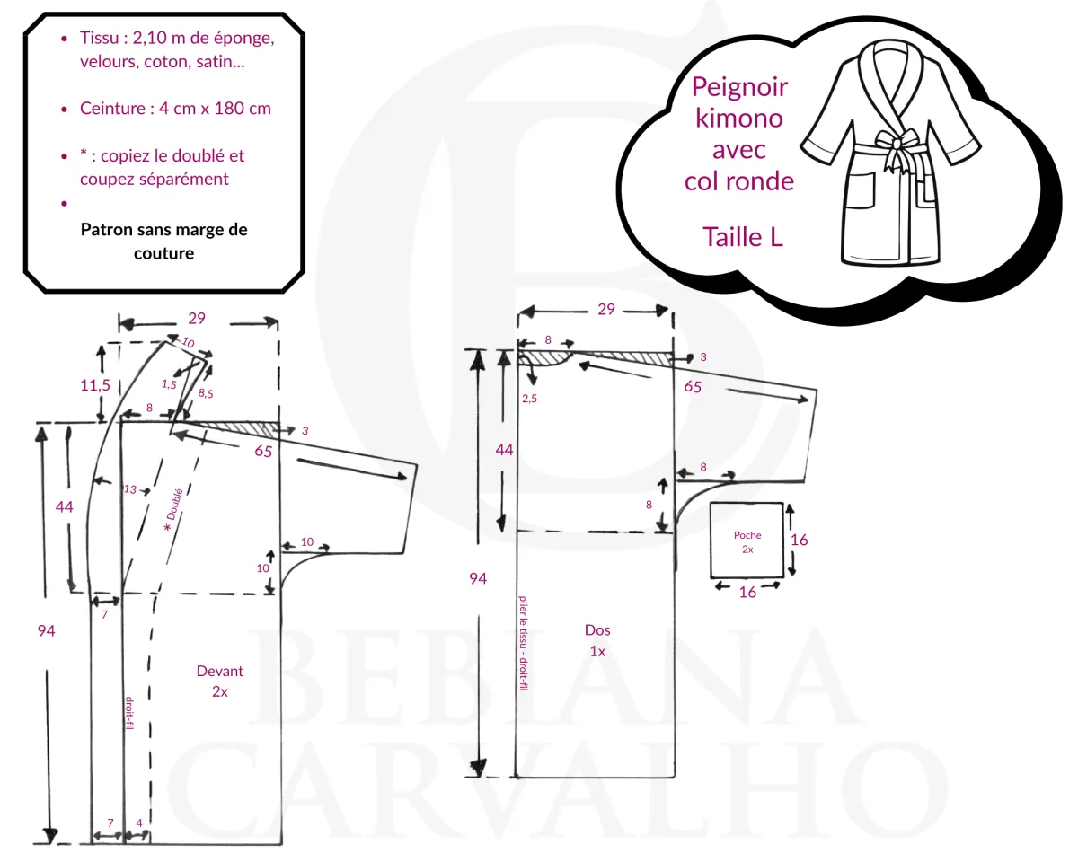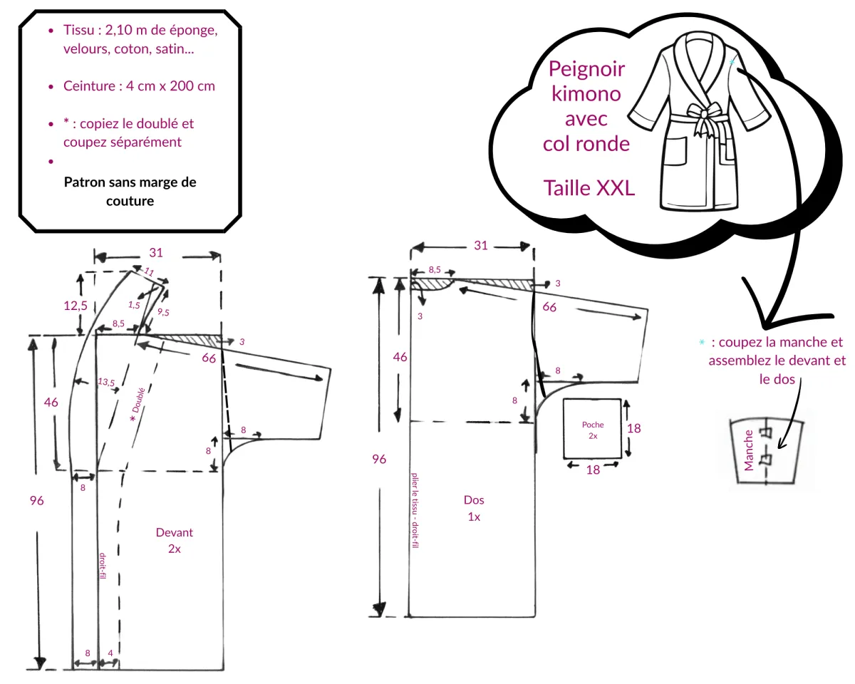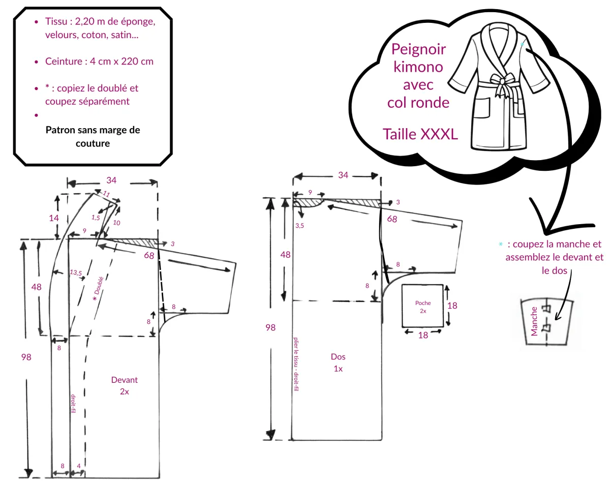 Schéma de patron pour robe, peignoir ou kimono unisexe à col rond, de la taille 36 à la taille 44. J'ai réalisé le patron avec une manche longue, mais vous pouvez séparer la manche en traçant une emmanchure sur le patron. Ensuite, prenez les pièces de manche avant et arrière et assemblez-les au milieu pour obtenir une manche sans couture. Vous pouvez également transformer la manche en manche raglan en dessinant sur le patron et en cousant les pièces de manche avant et arrière sur la partie supérieure.