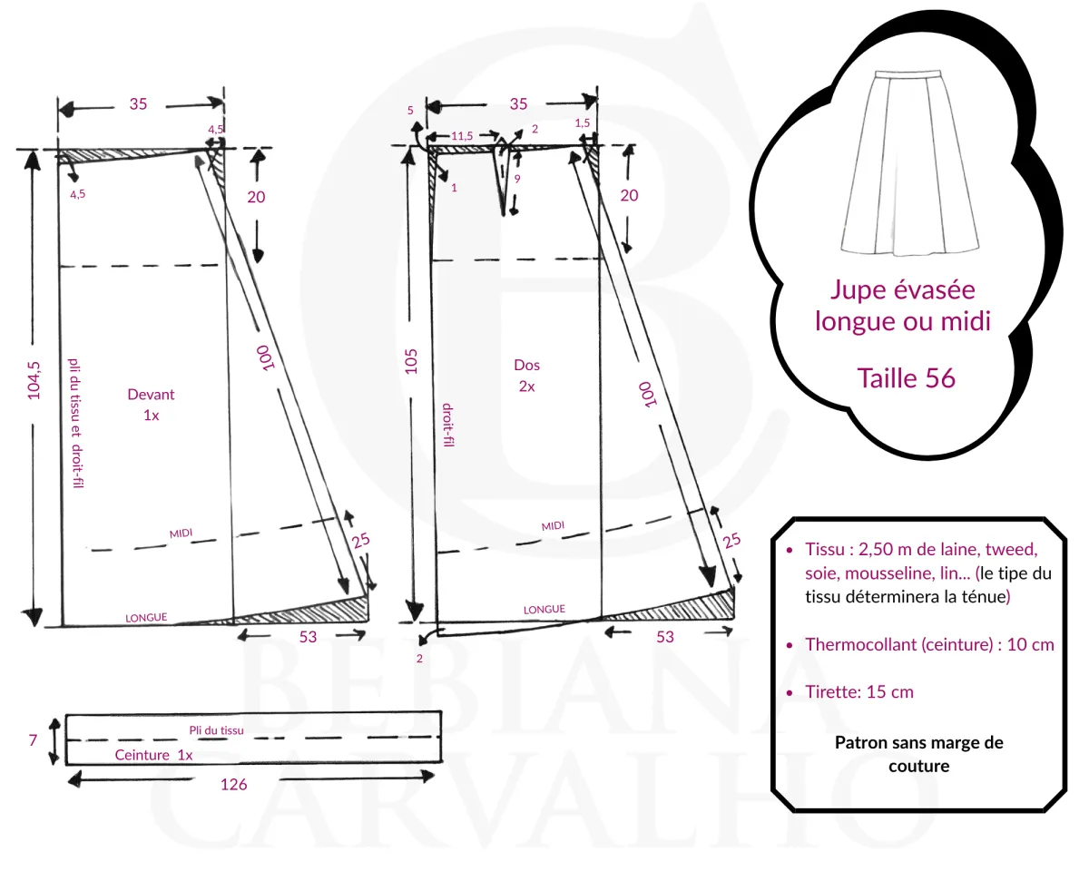 Schéma de patron pour jupe évasée longue ou midi, de la taille 34 à la taille 44 grande taille.